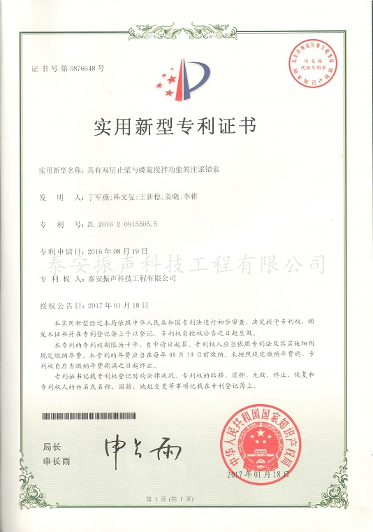 具有雙層止?jié){與螺旋攪拌功能的注漿錨索專利證書