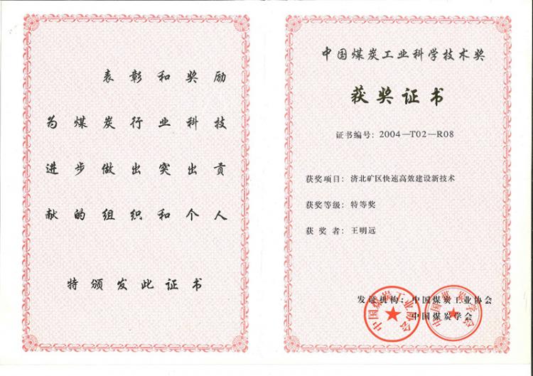 2004年中國煤炭工業(yè)科學(xué)技術(shù)獎特等獎